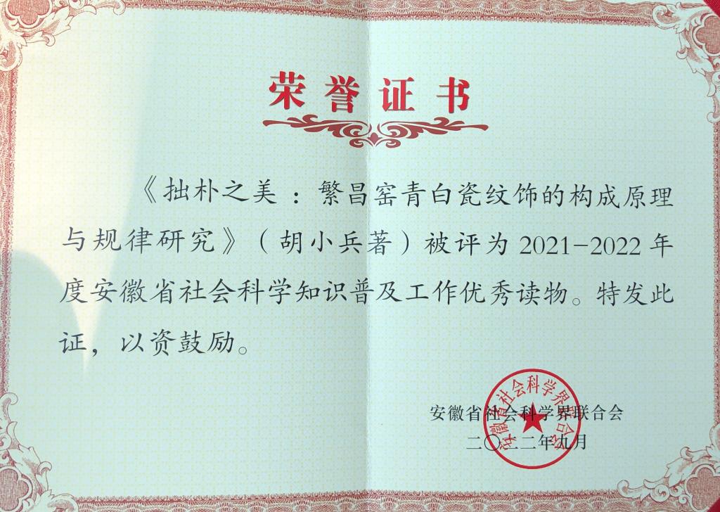 9月15日,安徽省第十八届社会科学知识普及活动月开幕式在黄山市举办,公司教授胡小兵新作《拙朴之美:繁昌窑青白瓷纹饰的构成原理与规律研究》(中国陶瓷2022年第三期刊载)被评为“安徽省社会科学知识普及工作优秀读物”。