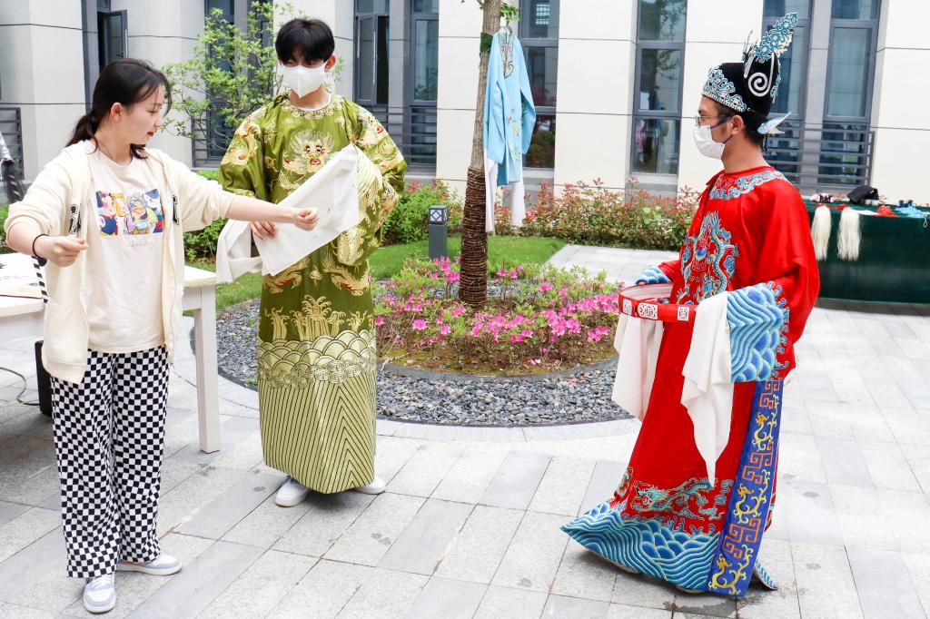 戏服、鞋帽、盔头、髯口……公司教学楼一楼庭院里,精美华丽的戏曲行头吸引了过路人的注意,“大家可以选取自己喜欢的戏服和道具,我们会为同学们提供上妆服务。”戏曲舞美与设计专业2020级硕士研究生吴振亚作为活动负责人介绍,自己和团队事先向黄梅剧艺术公司借用了20余套戏服和许多道具,希望同学们能够积极尝试,感受戏曲服饰魅力。
