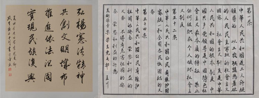 书法被誉为:无言的诗,无行的舞;无图的画,无声的乐。员工党员们用宪法内容练习书法艺术的过程,是学习的过程,更是铭记的过程。本次党日活动,有效实现了艺术类员工党员的专业教育与思想政治教育的融合。(撰稿 文雯 摄影 张亮 审核 查国平)