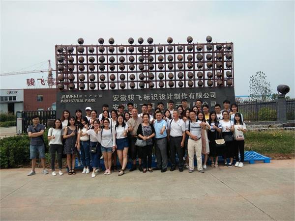 9月13日,我公司党总支书记江陈宝、教授石兰老师、环境设计专业教师黄明老师以及胡小兵老师带领全体设计专业员工赴安徽骏飞标识设计制作有限公司产品生产基地,考察调研。李继平董事长带领全体师生参观了公司艺术馆、生产基地,并详细讲解公司的发展历程和企业文化、创业历程。“感谢贵公司的特此邀请参观,让我们了解学习到了一件成品的设计生产流程…”、“参观后深受启发,需要学习的地方还有很多…”、“不能一直纸上谈兵,要理论结合实际…”全体人员来到会议室对于参观后纷纷有感而发。“脚踏实地,饮水思源”是该公司的理念也是李继平董事长给全体员工的寄语。