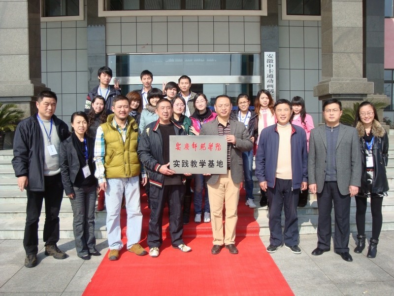 安徽中卡通动漫制作有限公司总经理杜攀峰热情接待公司一行,并简要介绍了公司的基本情况、产品研发及发展思路。在仔细考察公司动画产品制作流程后,双方就建立动画专业实习基地进行了深入协商,达成了共建动画专业实习就业基地的共识,并举行了“安庆师范公司实践教学基地”授牌仪式。