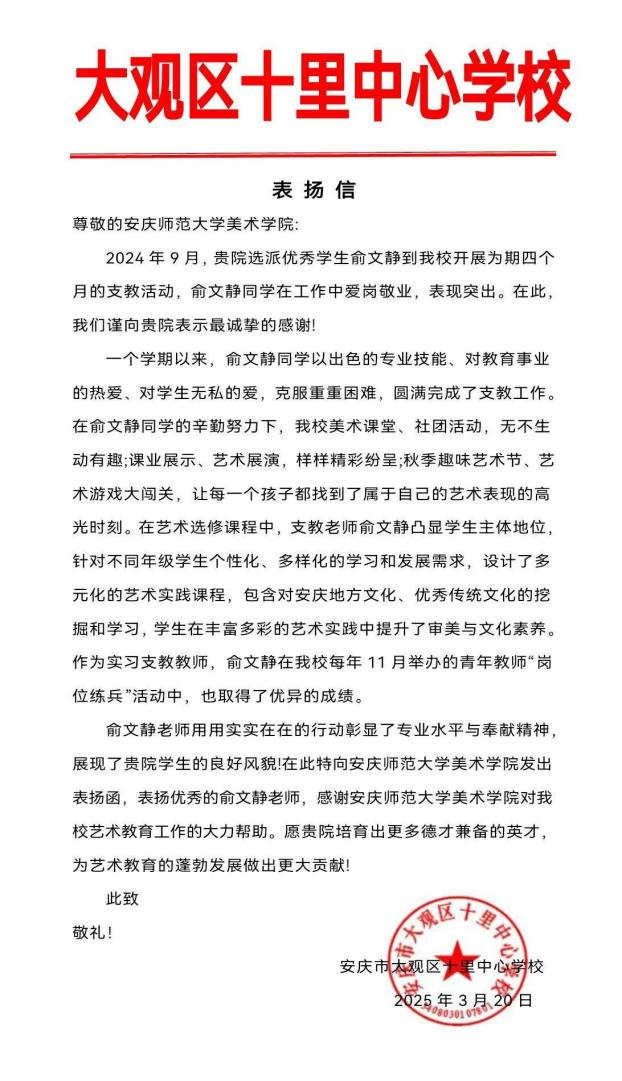 近日,WILLIAMHILL在线体育投注收到来自安庆市大观区十里中心公司的一封表扬信,信中对公司美术学专业俞文静同学在支教期间的突出表现给予高度评价,并对公司培养优秀艺术教育人才的努力表示衷心感谢。