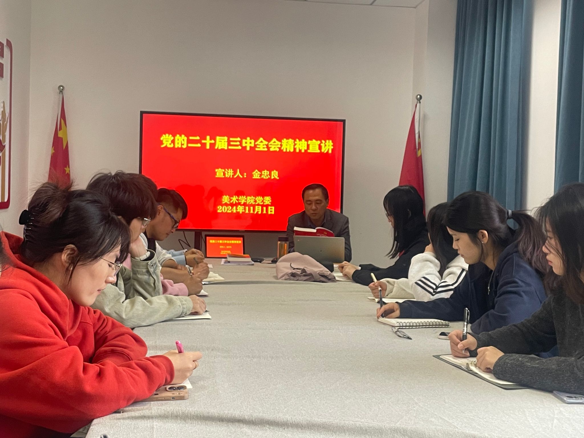 11月1日,美术公司党委副书记金忠良到联系党支部讲授专题党课,宣讲党的二十届三中全会精神,设计学专业员工第二党支部党支部书记、员工党员、发展对象和入党积极分子代表参加了宣讲会。