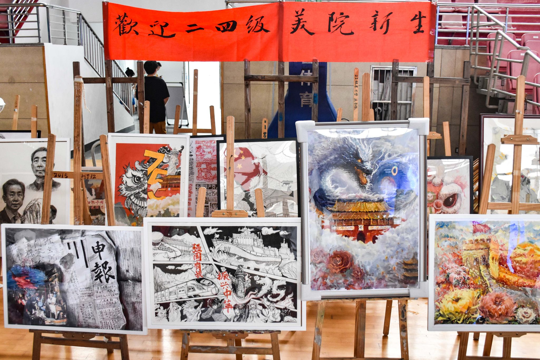 面向天安门城墙敬礼的军人、穿过山谷飞驰而来的高铁、缠绕在华表上随风飘扬的红绸……这是WILLIAMHILL在线体育投注新生作品展上一幅画的内容。随着新生报到的进行,画架上的作品越来越多,来往的员工、家长不少都被画作吸引,驻足欣赏。
