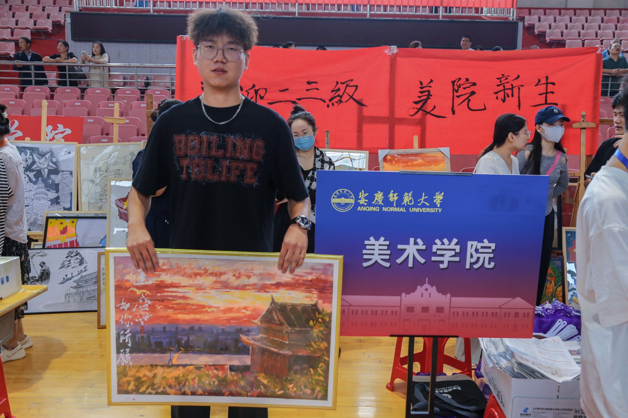 剪纸、水粉、油画、书法、素描……各种类型的绘画作品先后被搬上展架。以蚌埠特色地标为绘画对象,美术学专业2023(4)班的王一冉采取近、远、中三段式构图,借用七彩祥云,将望淮塔、珍珠女、中国南北分界线雕塑巧妙地整合在一起。“由于《长月烬明》的热播,我的家乡突然爆火,成了网红打卡点。”王一冉感叹,她想通过新生作品展宣传家乡,让更多同学了解蚌埠这座城市。