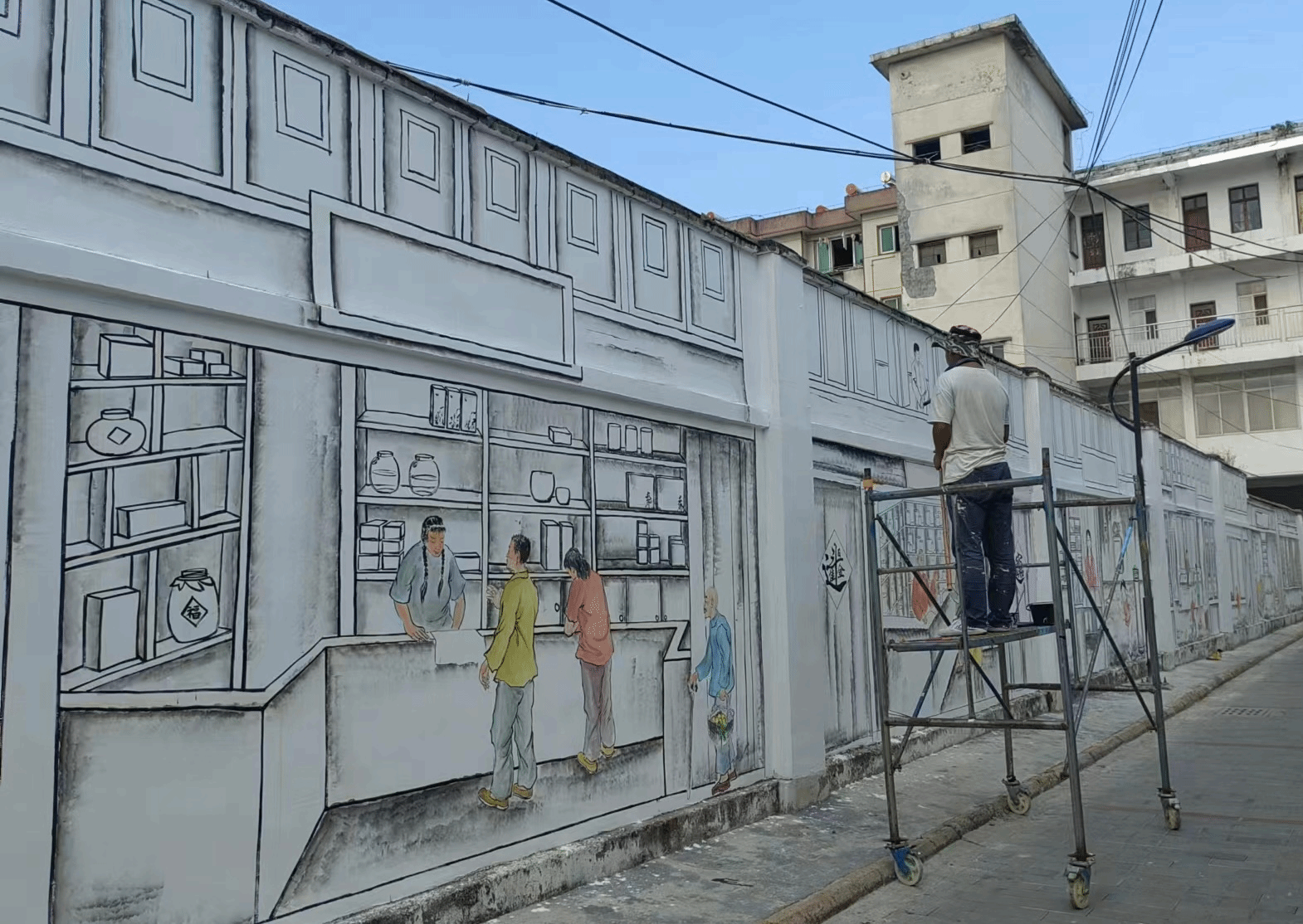 勾勒线稿、铺块上色,实践团成员历时3天,经过不断修改调整,在街巷入口处打造了一条长达30余米的靓丽“动车线”。“将动车元素融入老城区,激发城市的创意与活力,是我们的出发点。”服装设计专业2022级的查剑昊表示,团队在走访时发现街对面是一个车站,经商议,大家决定将动车“搬”到墙上,为老街带来一场跨时空的“对话”。