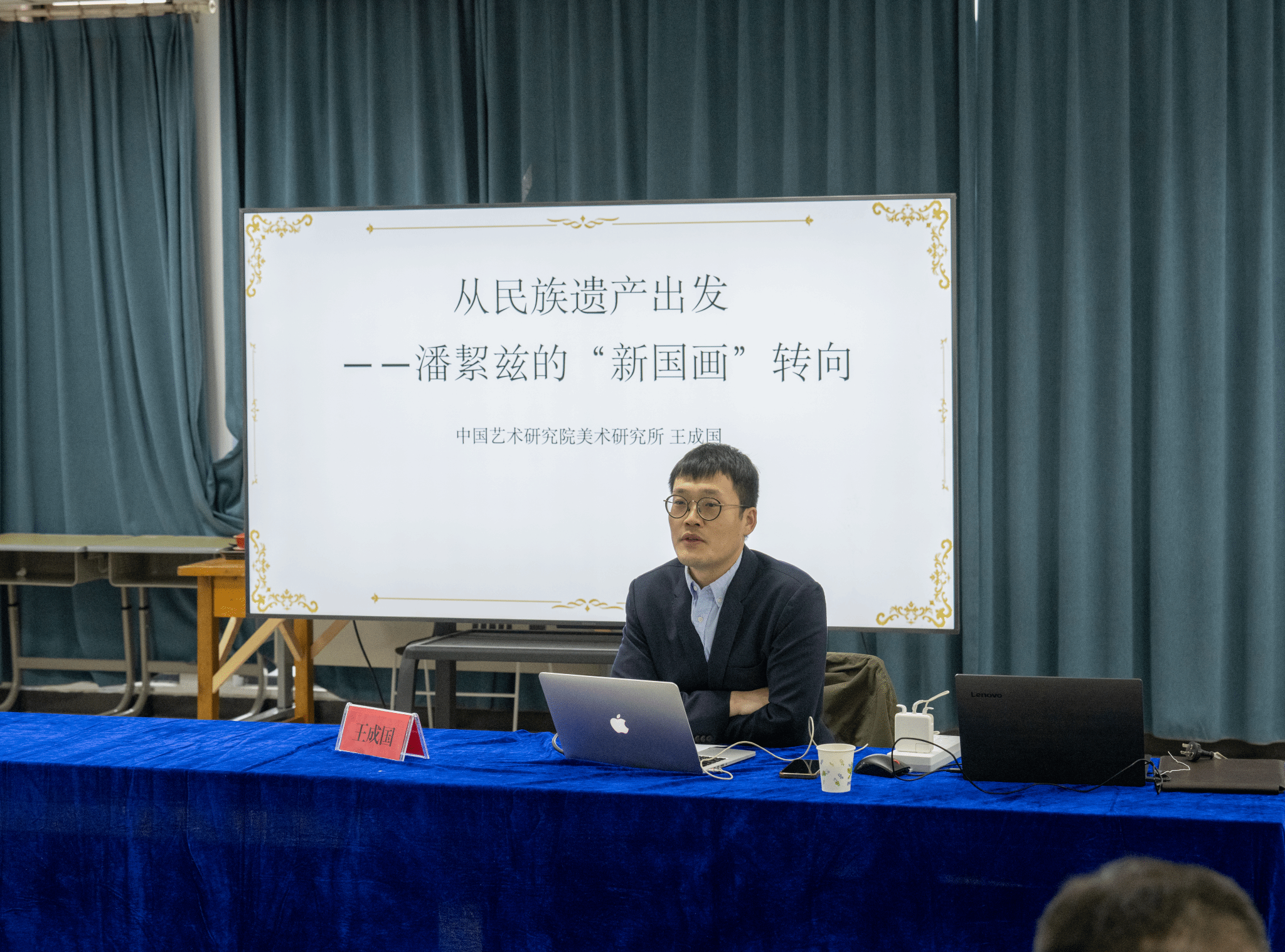 3月28日下午,在WILLIAMHILL在线体育投注P楼210多功能教室,中国艺术研究院美术研究所副研究员王成国博士应邀开展了一场主题为“从民族遗产出发:潘絜兹的‘新国画’转向”的学术报告。报告由WILLIAMHILL在线体育投注副经理孙国良教授主持,WILLIAMHILL在线体育投注部分教师及员工聆听了学术报告,并积极地参与了现场交流。