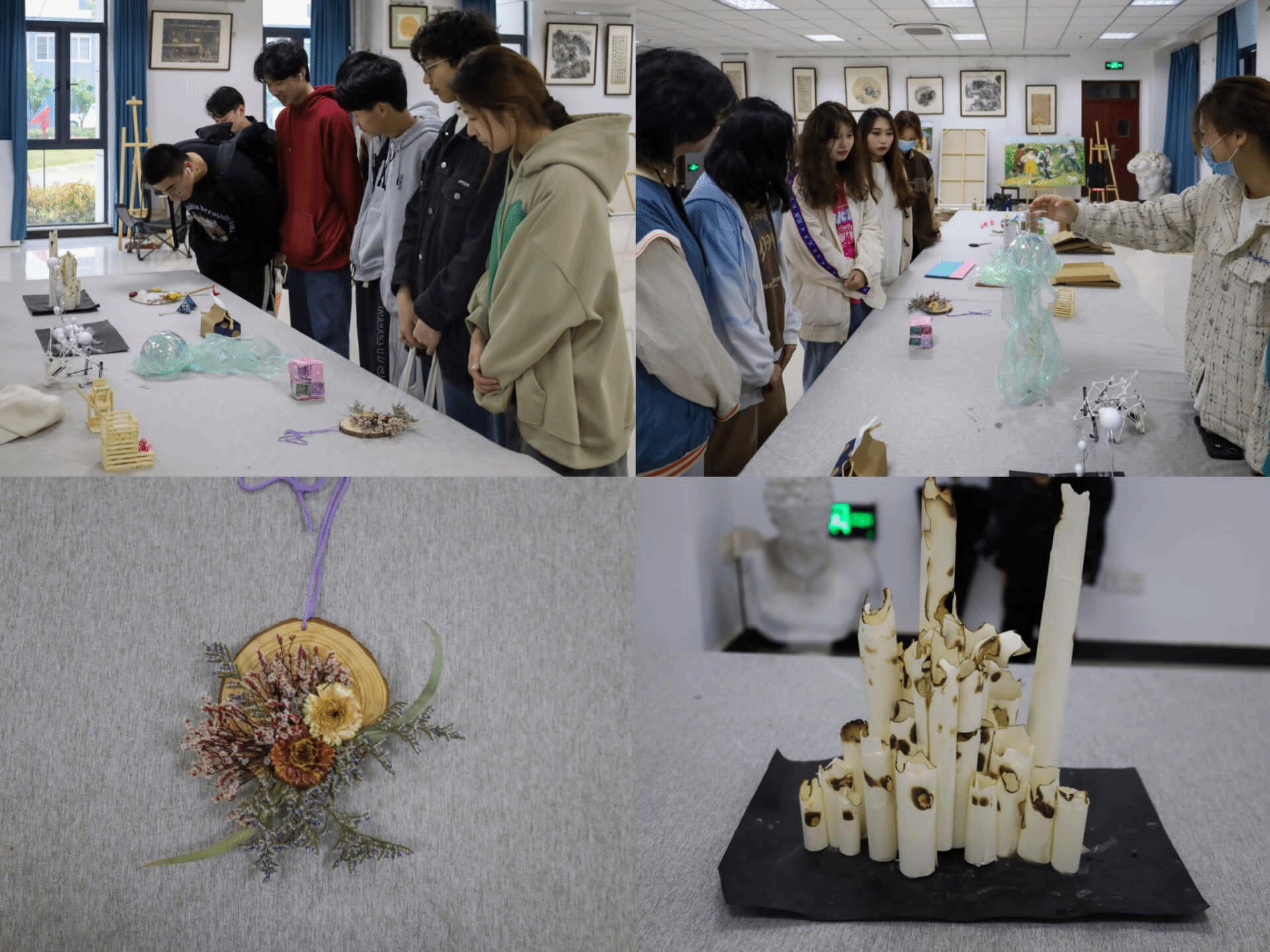 一个由纸张拼接而成,并伴有火烧痕迹的作品凭借其独特的风格吸引了不少员工驻足观看。制作者、设计学类专业2022(2)班的任诗娟介绍,每次画画都会扔掉不少纸张,非常浪费,她便将平时废弃的纸张积攒下来,制成了作品《废墟》。“城市的环境污染问题仍需重视,这份作品是想要呼吁大家爱护环境,保护好我们的家园,共享绿色生态。”