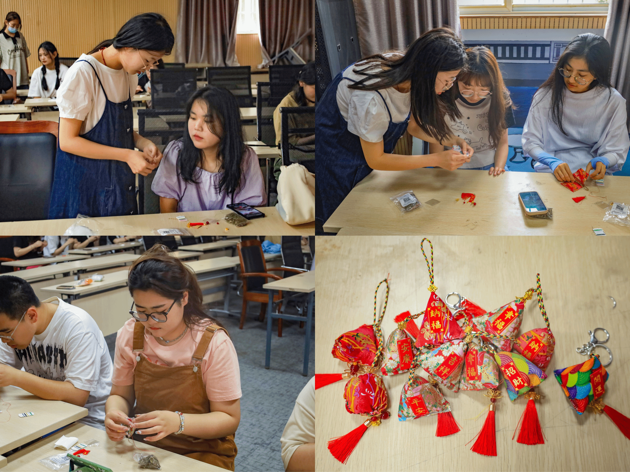 “先将布料裁剪成自己喜欢的形状,再将其缝成香袋,最后装入香料进行封边。”活动现场,视觉传达设计专业2021(2)班的胡雯婷化身“小老师”,指导员工们进行香包制作。“当我看到大家专心地为母亲准备礼物时,我感到十分温馨。”她介绍,此次活动中香料的主要成分是艾叶,可以排毒减压、舒缓疲劳。“同学们亲手制作养生礼物送给母亲,既别致又有新意。”