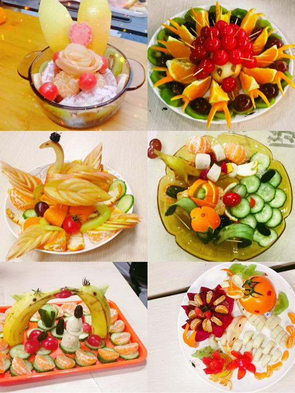 香蕉做“船”、火龙果和橙子上面雕花、苹果切片搭成“白鹤”……参赛员工们的奇思妙想让水果们彷佛参加了“变形计”。不仅如此,固定拼盘造型用的牙签,装饰造型用的葡萄串茎杆和剩余橙子皮,各种边角料都没有被浪费。设计专业2020(2)班的张晴晴介绍:“我们把一些平时会被同学们遗弃的水果‘部件’也融入了我们的作品中,希望借此传达‘变废为宝、节约资源’的观念。”