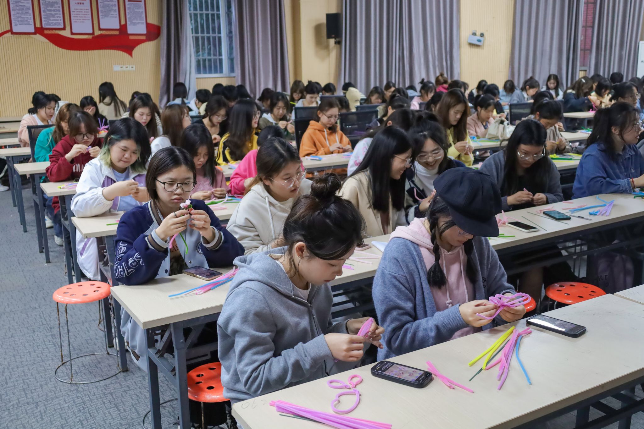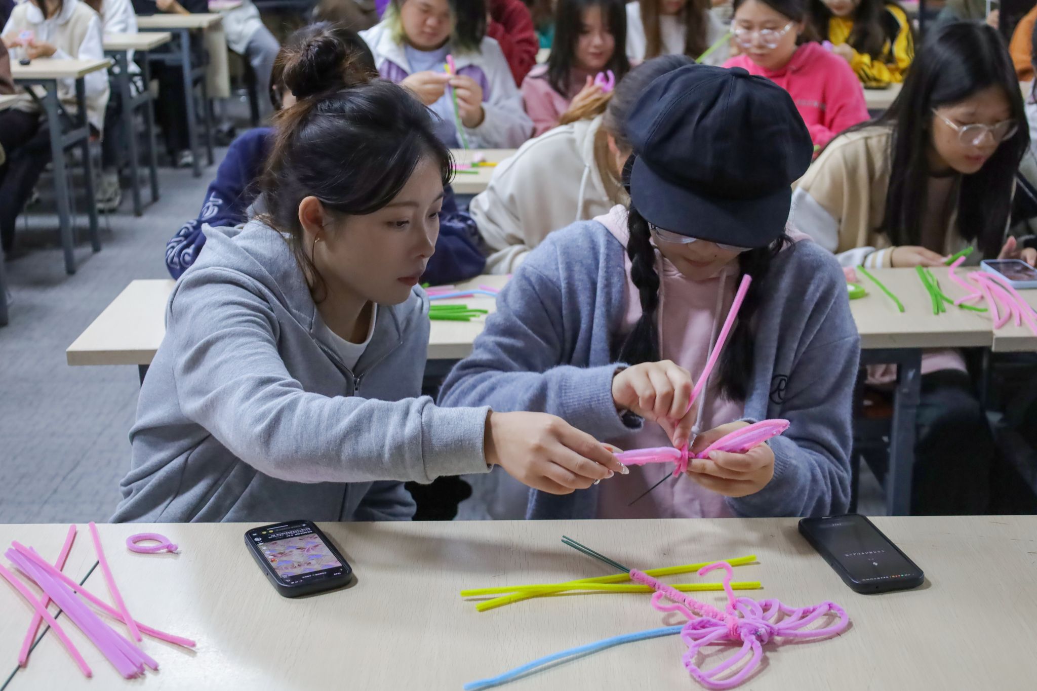 制作现场,设计学类专业2023(4)班的张素岚手持剪刀与胶带,十指跳动、上下翻飞,动作十分娴熟。四根质地柔软的扭扭棒在她手中不断翻折交织,形成五瓣舒展的百合花瓣。紫粉交错的百合花是今天体积最大的扭扭棒永生花,引得不少同学连连赞叹。“其实我是一位‘云手工达人’,喜欢在各个平台观看手工教程,没想到第一次实操这么顺利,希望这朵百合花能为收到它的老人带去温暖。”