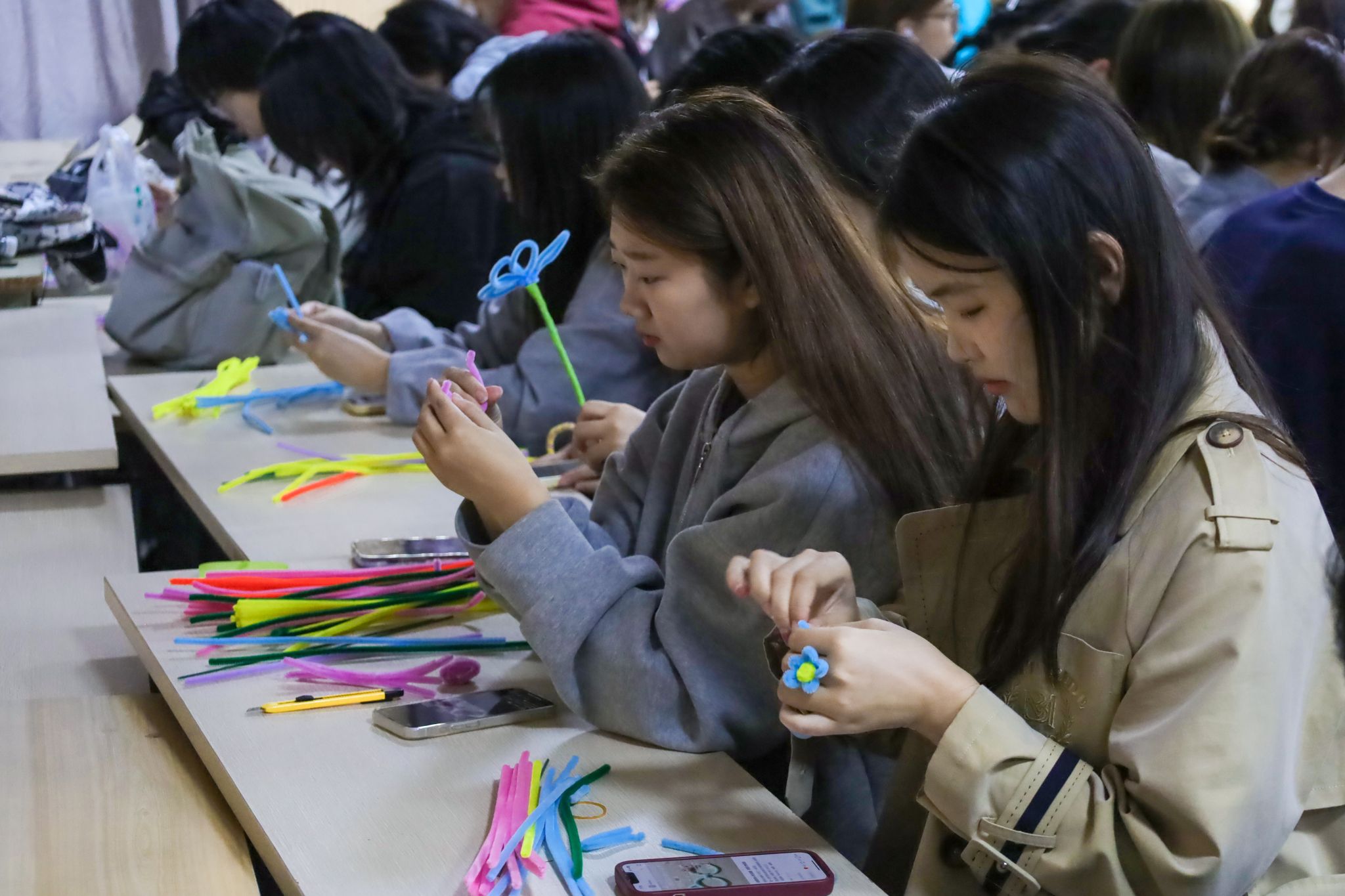 随着员工们手指翻飞,一枝枝娉婷秀美的绣球、花容婥约的郁金香纷纷“争奇斗艳”,色彩柔和、花型各不相同的永生花构成了一道独特的风景线。许多同学用手机记录下自己的手工制品,将这份温暖与成就感分享给亲友。