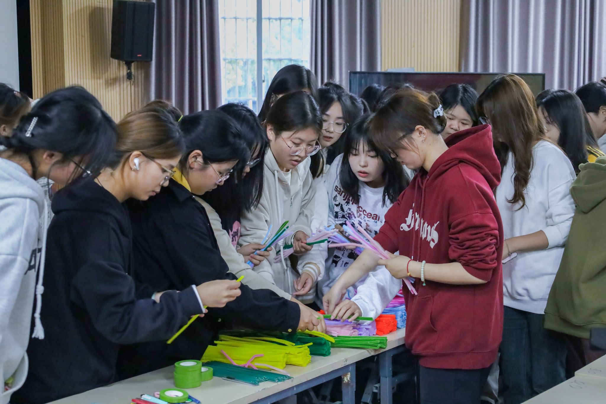 2000根扭扭棒、200根手工花杆、26把剪刀、10卷胶带……早在一周前,活动负责人、设计学专业2022级的单冠瑞便着手准备活动所需材料。他表示,由于鲜花易凋零,所以他将目光转向了可操作性强、成品美观的扭扭棒永生花,希望这些永不凋零的花朵能够始终陪伴老人。