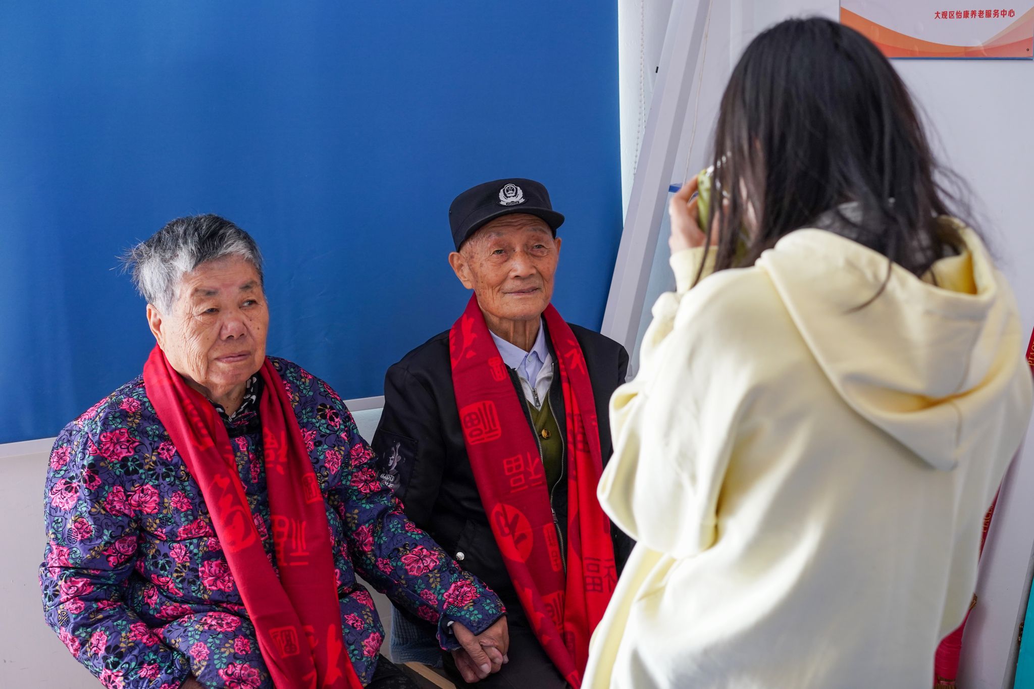 戴上酒红的围巾,挺直脊背,这些平日里很少拍照的老人,对着镜头露出羞涩的笑容。视觉传达设计专业2022(2)班的林祎雯手持拍立得,闪光灯闪烁后,被定格的生动瞬间在相纸上逐渐成像:向镜头敬礼的抗美援朝老兵、一对十指相扣的老年夫妇、笑着比了两个“剪刀手”的奶奶……林祎雯将所有成片整整齐齐摆在桌面上,为它们拍摄了一张“全家福”并上传至社交媒体,感叹这是于她而言十分有意义的时刻。