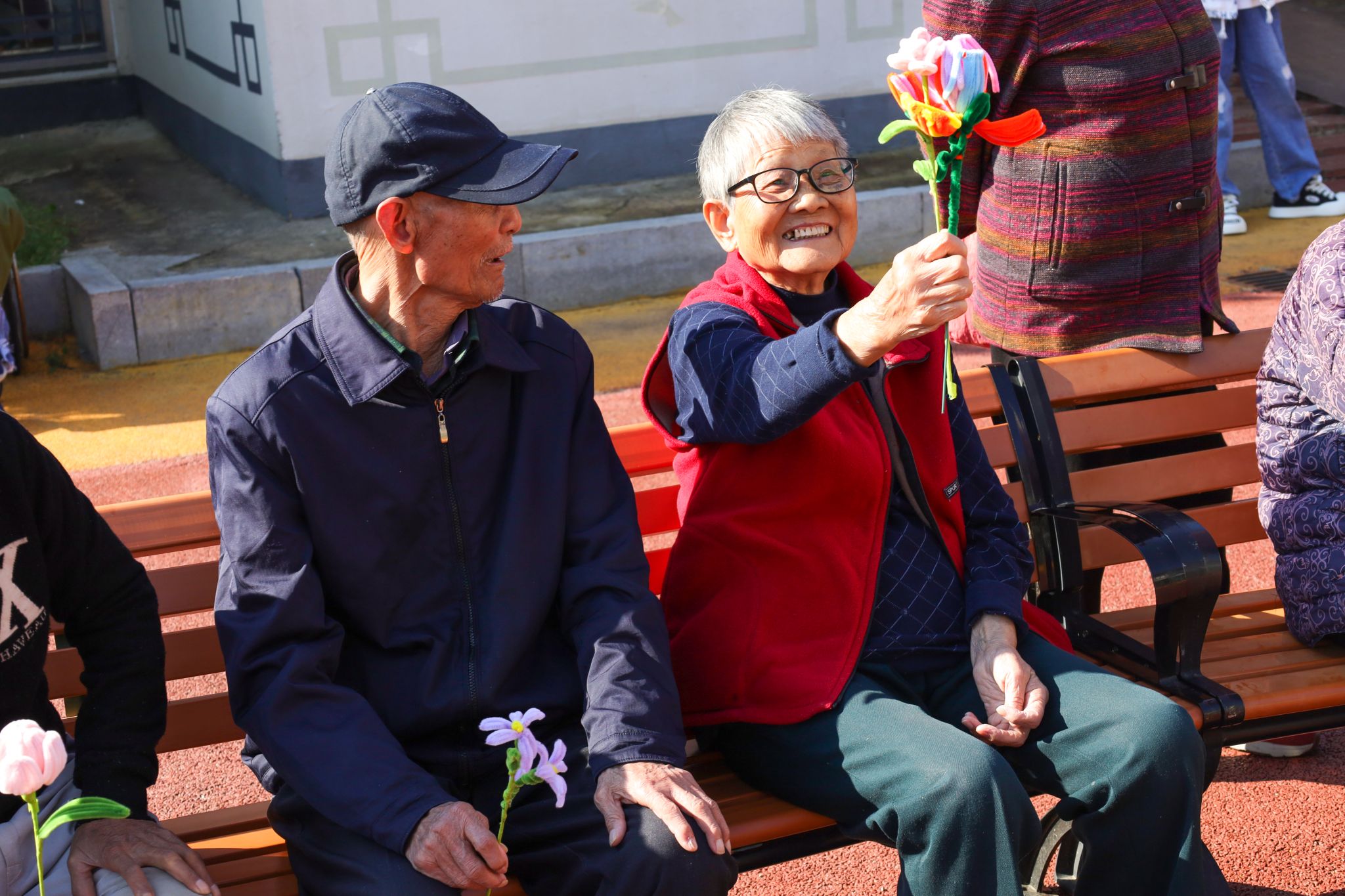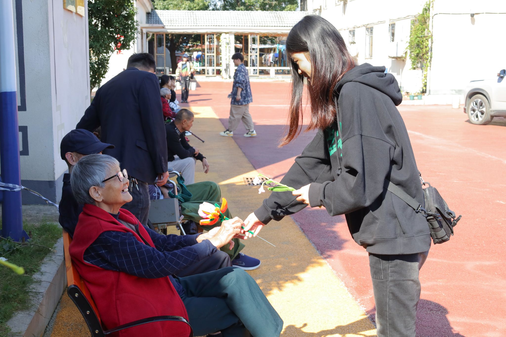 第一个收到手工永生花的是正坐在庭经理椅上晒太阳的李奶奶,她在花束中挑选了一支粉色郁金香,举起来对着阳光仔细端详。在得知花束均由员工手工制作时,她感到十分惊喜,不停地跟同行的老奶奶赞叹员工们手艺的精巧,并将这朵永不凋零的郁金香放在枕边。不到半小时,50余朵手工花全都作为见面礼,“占据”了老人们房间内的最显眼的位置。