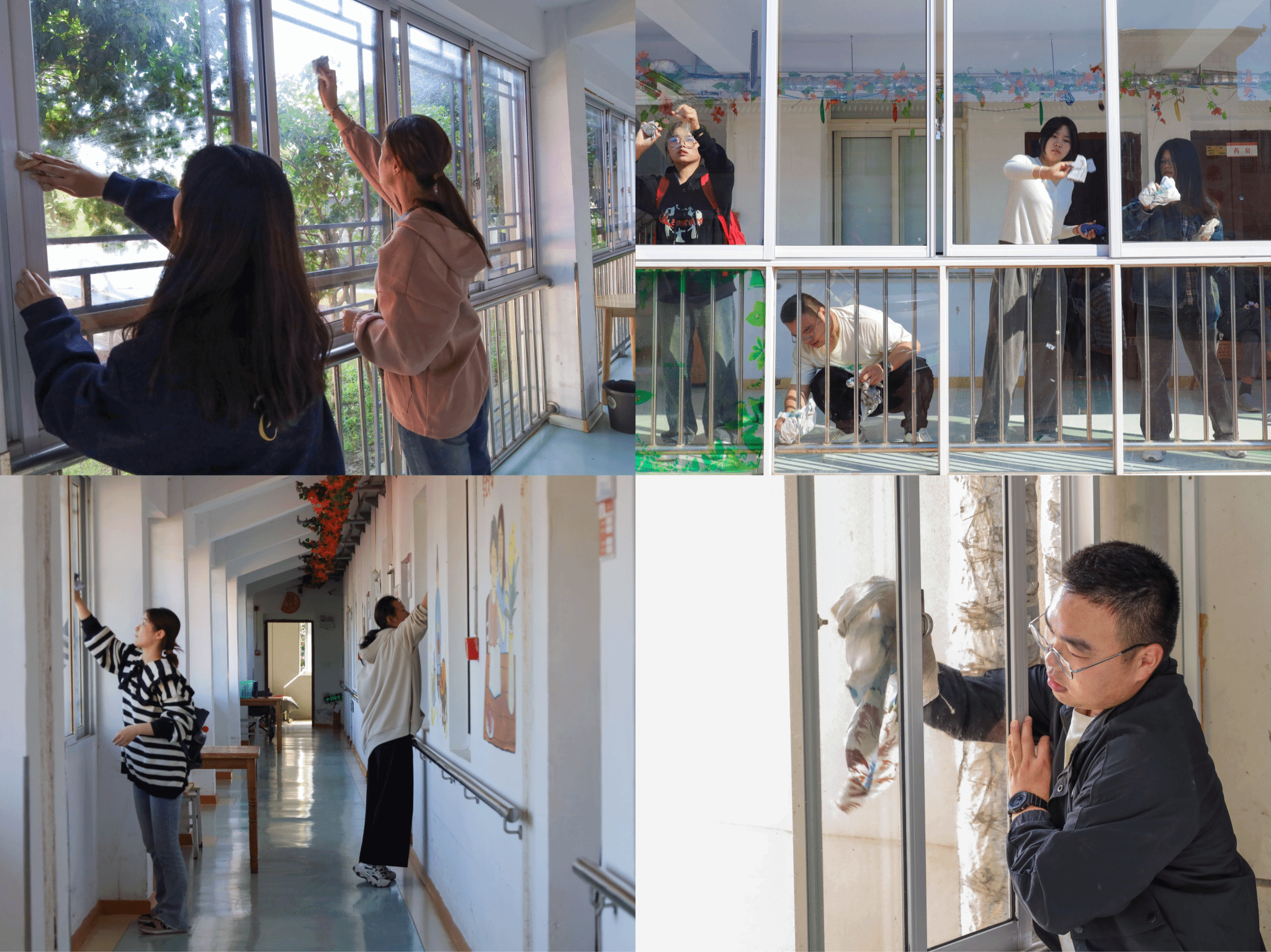 “这栋楼的玻璃被你们擦完后真干净!”服务中心的老人们在散步之余为员工们的劳动成果“点赞”。在20余名志愿者齐心协力下,怡康养老服务中心两层楼的门窗、地板焕然一新。活动负责人、设计学专业2022级的单冠瑞表示,希望窗明几净的居住环境能为老人们带来更好的居住体验和愉悦的心情。
