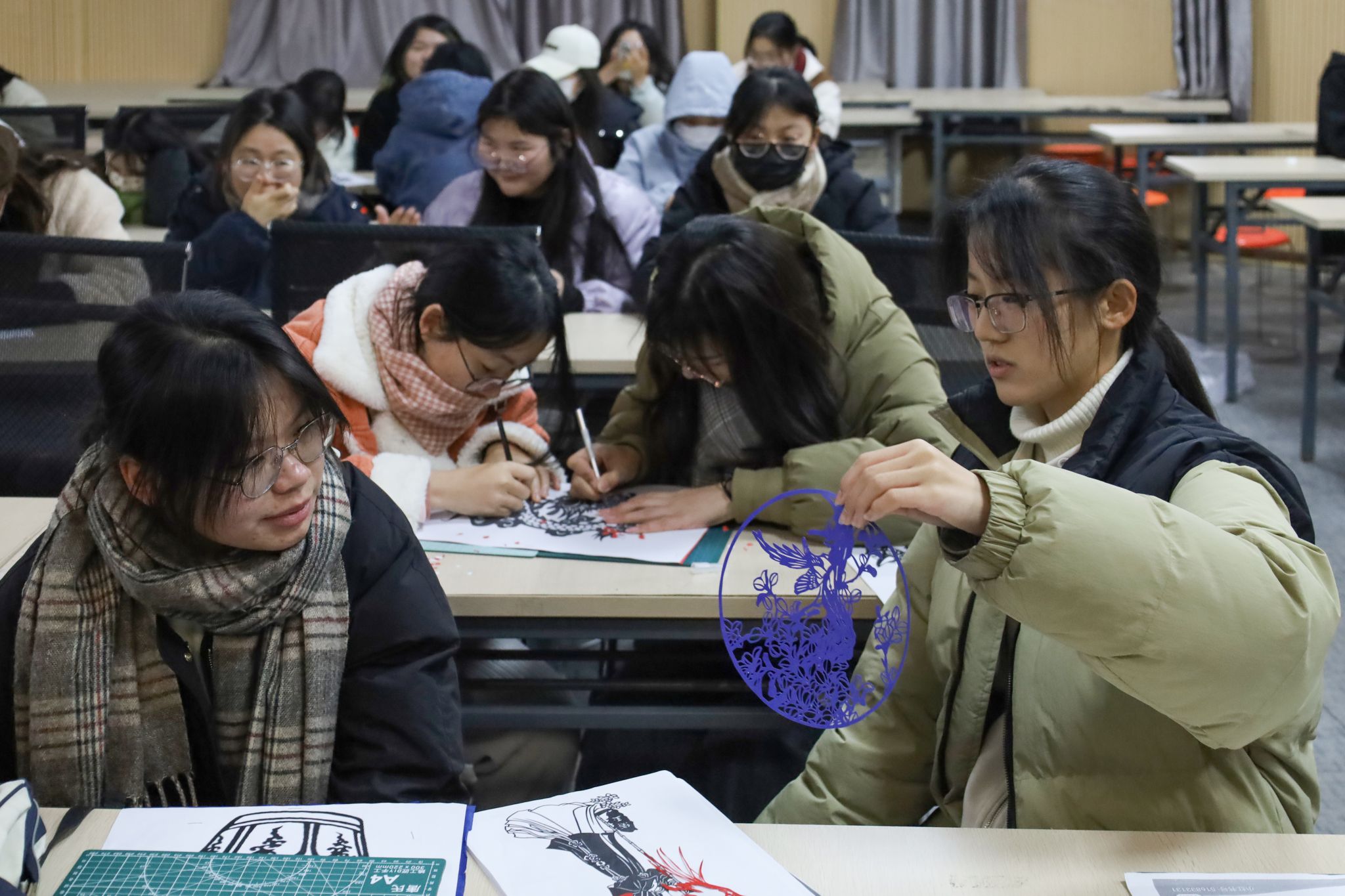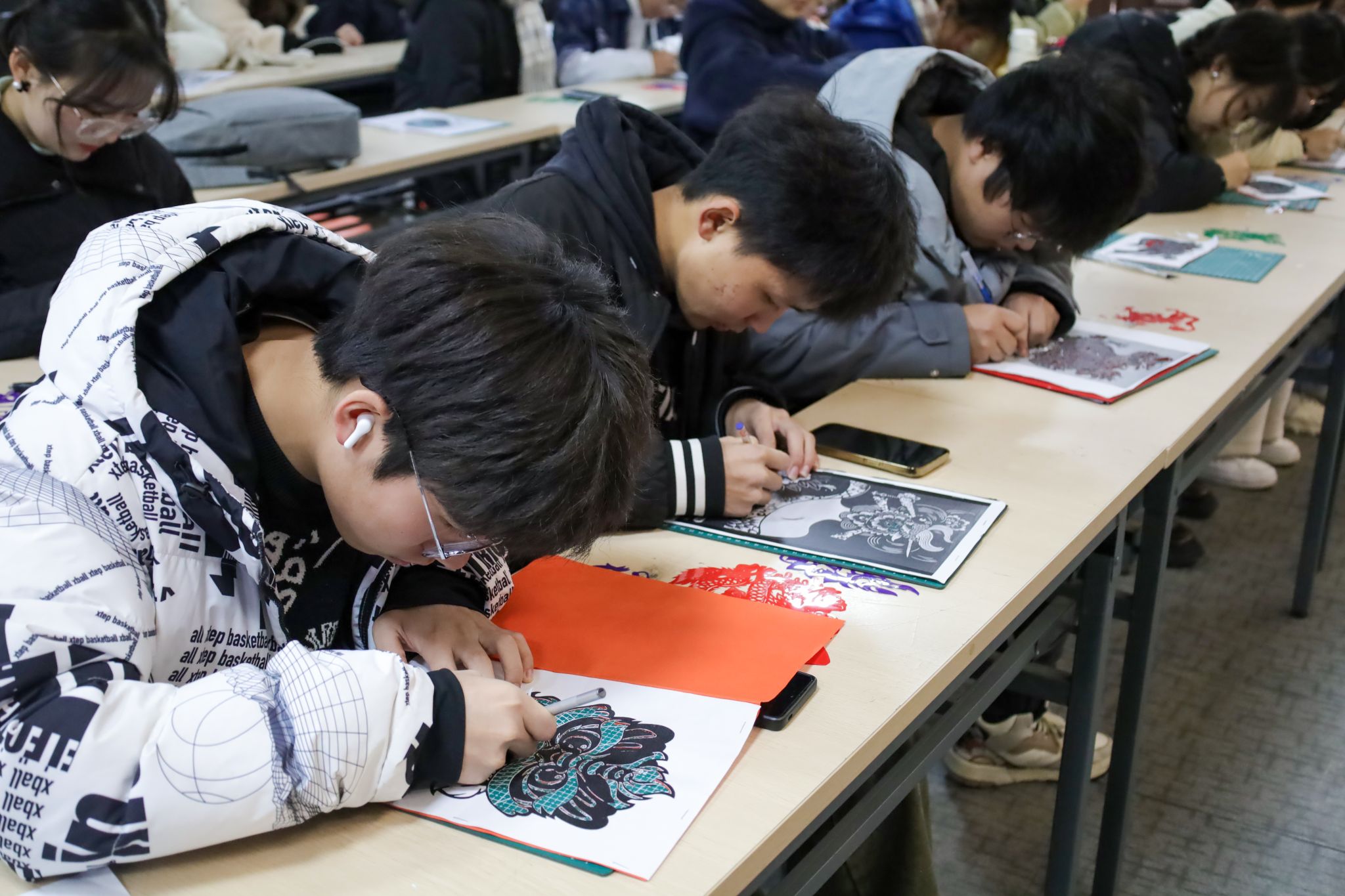 随着刀尖不停地在热转印红纸上穿梭,双手舞动间,一幅幅气韵生动、形神兼备的龙元素剪纸作品惊艳亮相。经过三小时的雕刻,动画专业2023级的李爽揭开了手中压轴作品的“神秘面纱”,一条吞云吐雾的巨龙盘踞于桌面,线条呈现出力与美的张力,具有中国气派的神韵引来一众称赞。